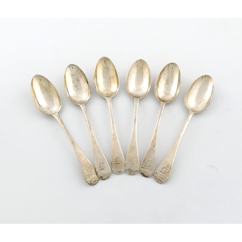A set of six George III Scottish silver Old English pattern dessert spoons