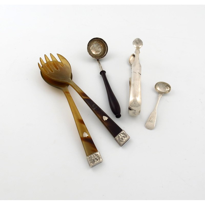 comprising: a pair of Greenock Fiddle sugar tongs, fluted bowls, a pair of silver-mounted horn salad servers, by J.G and S, also marked Sterling, a salt spoon with maker's mark of J.P, plus a toddy ladle, with maker's mark of C.J, possibly for Charles Jamieson. (5)