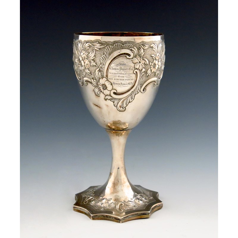 urn shaped bowl, later embossed decoration, on a raised ten sided foot, inscribed 'To Thomas Poyser Esq. As a small token of regard from his sincere friend Henry James, M.D,', gilded bowl, height 19cm, approx. weight 8.9oz.