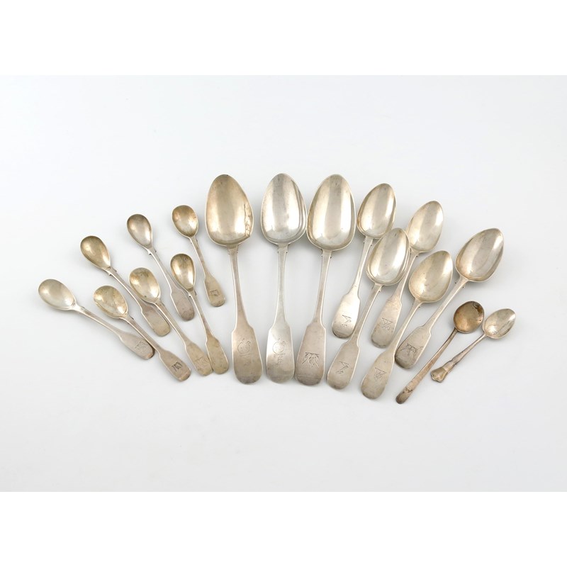 comprising: a set of four egg spoons, by William Cummins, Dublin 1838, three tablespoons, and five dessert spoons, the terminals crested, plus three Italian silver egg spoons, and two other spoons, approx. weight 17oz. (qty)
