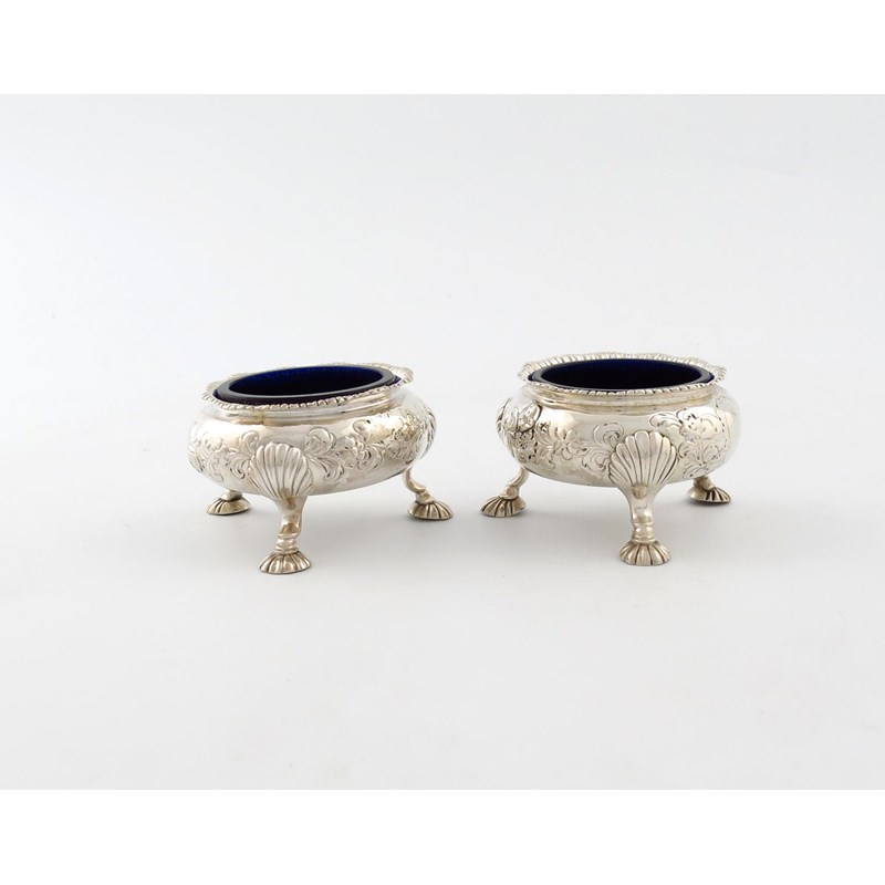 circular cauldron form, chased foliate decoration, gadroon borders, on three shell capped scroll feet terminating in fluted feet, with blue glass liners, diameter 8cm, approx. weight 7.4oz. (2)