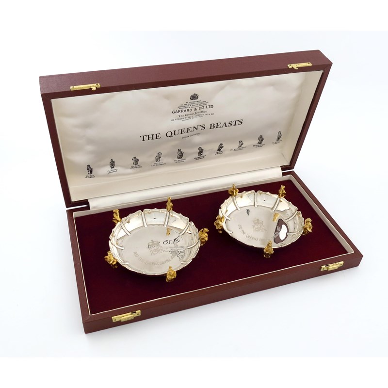 lobed circular form, each mounted with five silver-gilt Queen's Beasts, the centre engraved with the Royal cipher and '1952 The Queen's Silver Jubilee 1977', in a fitted case, diameter 12.5cm, approx. weight 18oz. (2)