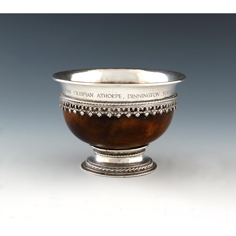 By Omar Ramsden, a silver-mounted Arts and Crafts mazer bowl,