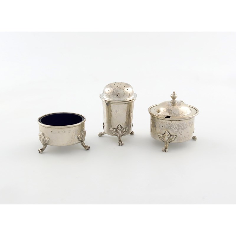 By A.E Jones, a three-piece silver Arts and Crafts condiment set,