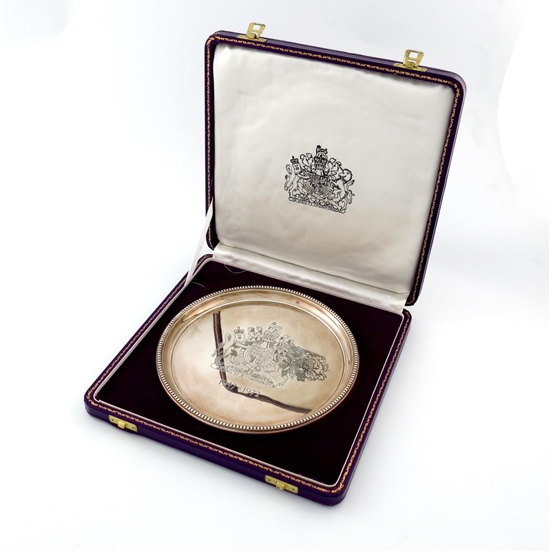 celebrating the silver wedding of Her Majesty The Queen and Prince Phillip, circular form, beaded border, the centre with the Royal arms, in a fitted case with a certificate, diameter 20.4cm, approx. weight 9.8oz.