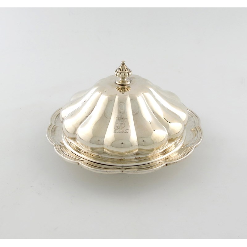 circular fluted form, the domed cover with a fluted finial, engraved with a crest, diameter 21.2cm, approx. weight 24.9oz.