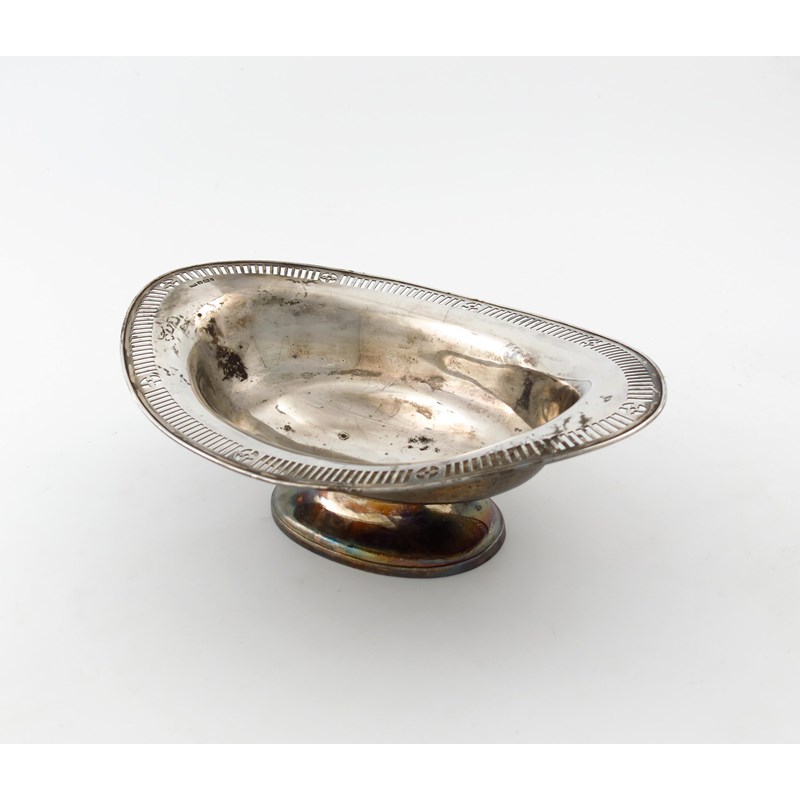 oval form, pierced border, on a raised circular foot, length 29.2cm, approx. weight 13.8oz.