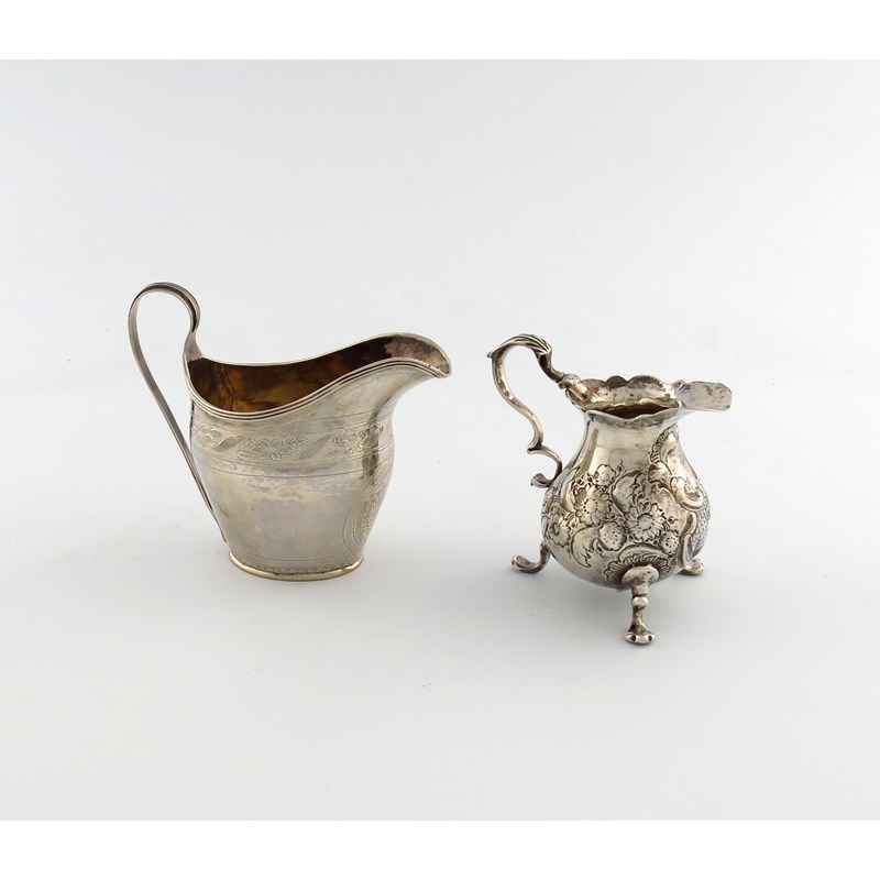 oval form, scroll handle, engraved decoration, plus a George II silver cream jug, of bluster form, embossed foliate decoration, London 1743, approx. total weight 6.5oz. (2)