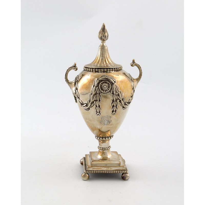 modelled as a George II sugar vase, scroll handles, swag and medallion decoration, the pull-off cover opens to reveal a pierced foliate inner cover, on a square base on four ball feet, initialled, height 21.5cm, approx. weight 11.5oz.