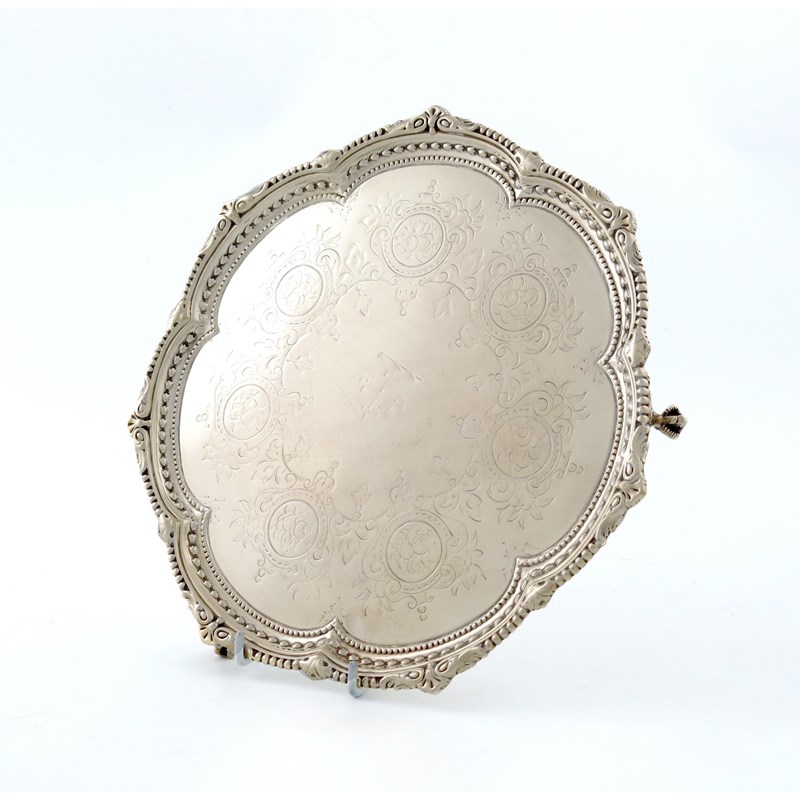 circular form, beaded border, the centre with engraved decoration, on three claw and ball feet, the centre with a crest, diameter 25cm, approx. weight 18.5oz.