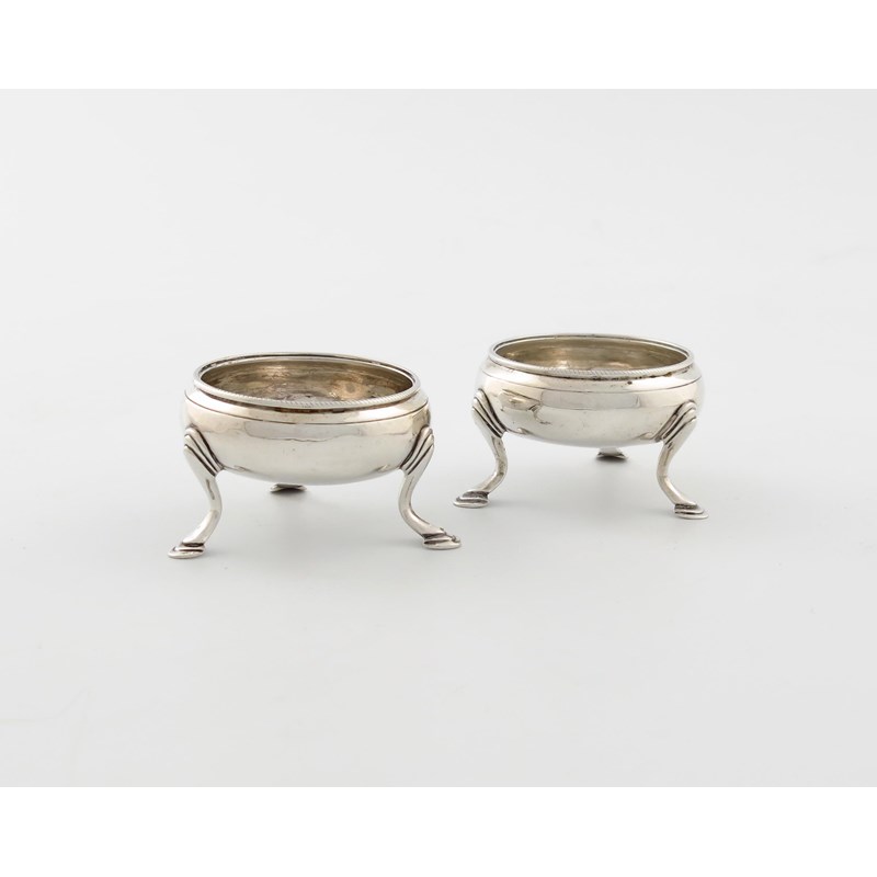 plain cauldron form, rope-work borders, on three hoof feet, diameter 6cm, approx. weight 2.5oz. (2)