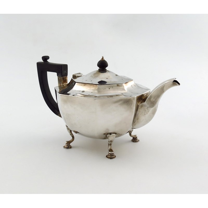 octagonal panelled form, scroll handle, on four scroll feet, length handle to spout 25.2cm, approx. weight 17.5oz.