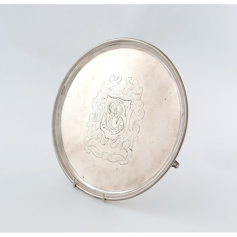 circular form, reeded border, the centre with a later monogram within foliate mantling, on three bracket feet, diameter 25.8cm, approx. weight 17.4oz.