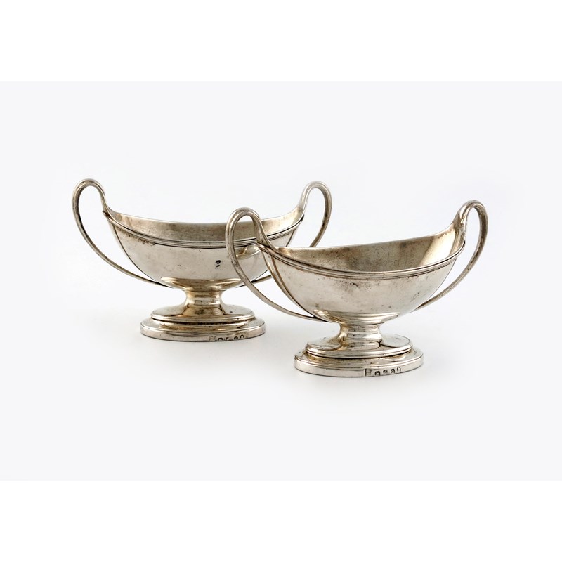 oval form, scroll handles, on raised oval bases, engraved with a crest, length handle to handle 13.5cm, approx. weight 7oz. (2)