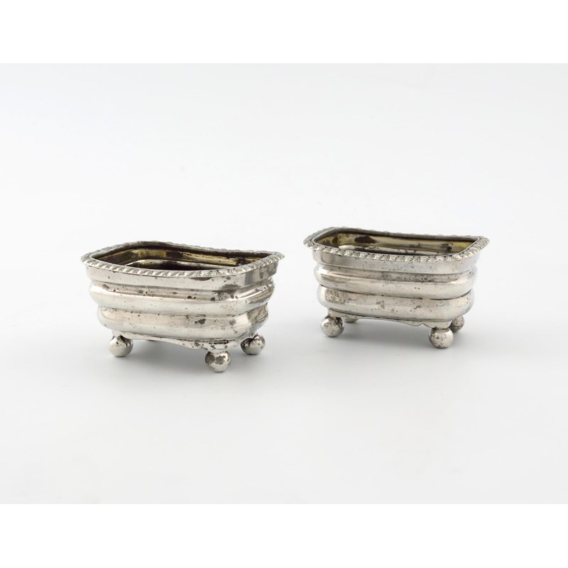 rounded rectangular form, foliate border, on four ball feet, length 8.3oz, approx. weight 5.8oz. (2)