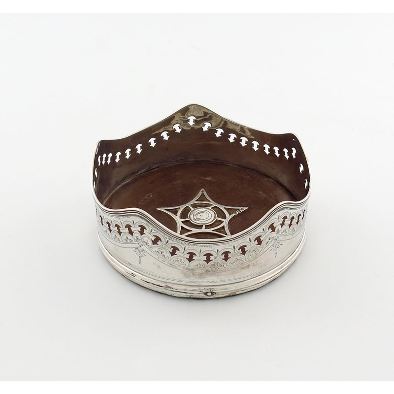 circular form, wavy-edge reeded border, pierced and bright-cut decoration, wooden base, diameter 13cm.