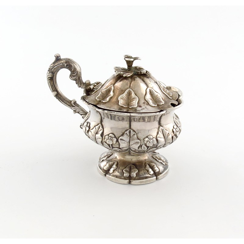 lobed circular form, the hinged cover with leaves and a foliate finial, scroll handle, on a raised circular foot, height 9cm, approx. weight 6oz.