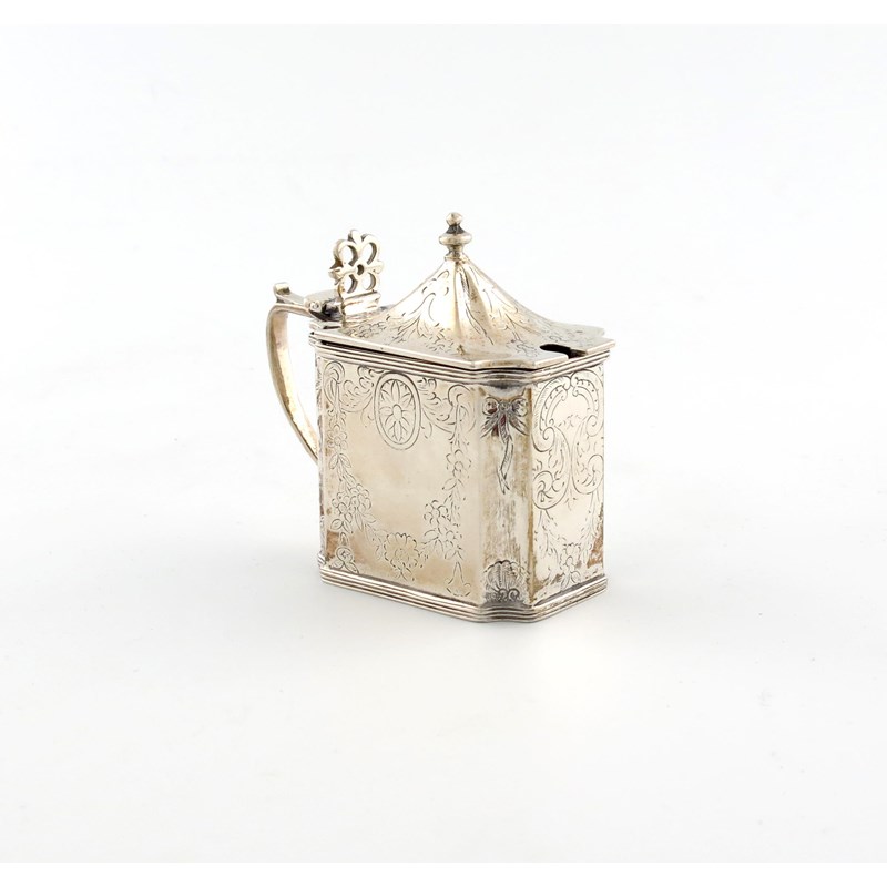 rectangular form, incurved corers, engraved foliate decoration, hinged cover with an urn finial, scroll handle, with a clear glass liner, height 9cm, approx. weight 4.4oz.