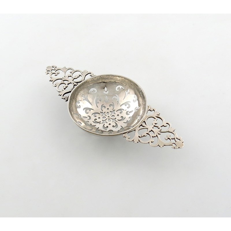 circular bowl with pierced foliate scrolls, with two pierced foliate scroll handles, length handle to handle 18cm, approx. weight 2oz.