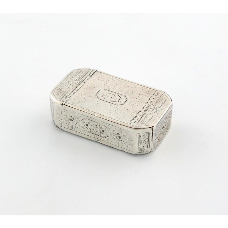 rectangular form, canted corners, flush hinged cover, engraved foliate decoration, length 6.8cm, approx. weight 1.8oz.
