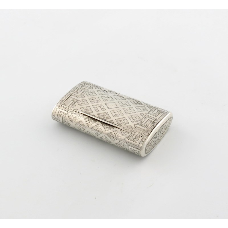rectangular form, engraved lattice decoration, flush hinged cover, Greek key border, length 7.3cm, approx. weight 1.7oz.