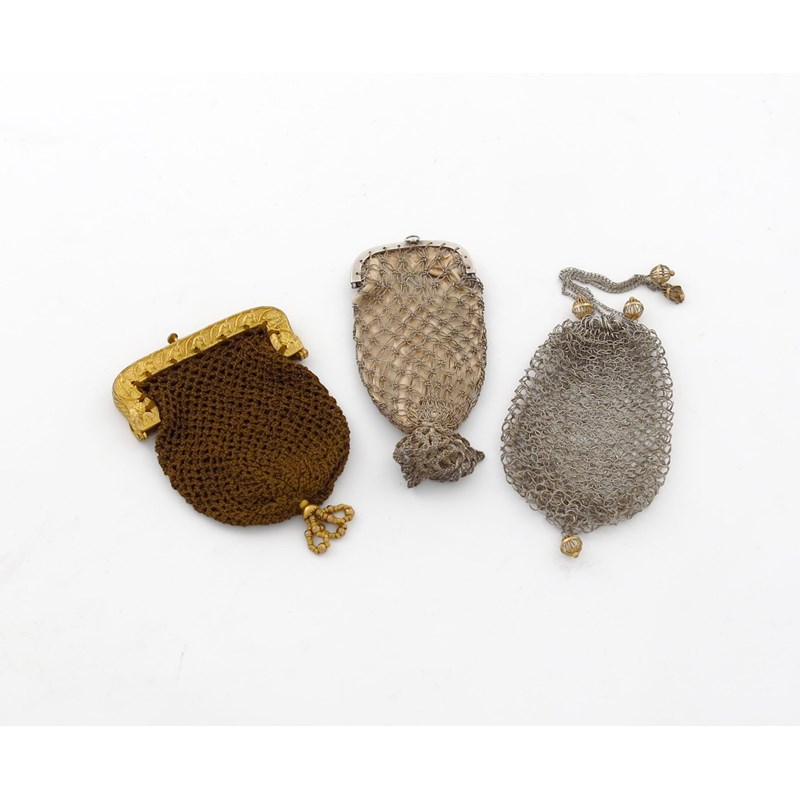 the material purse with silver thread decoration, plus a mesh draw-string purse and