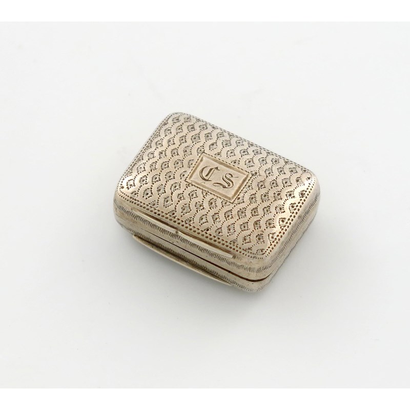rectangular form, engraved decoration, the grille pierced with a basket of fruit and scrollwork, length 2.5cm, approx. weight 0.2oz.