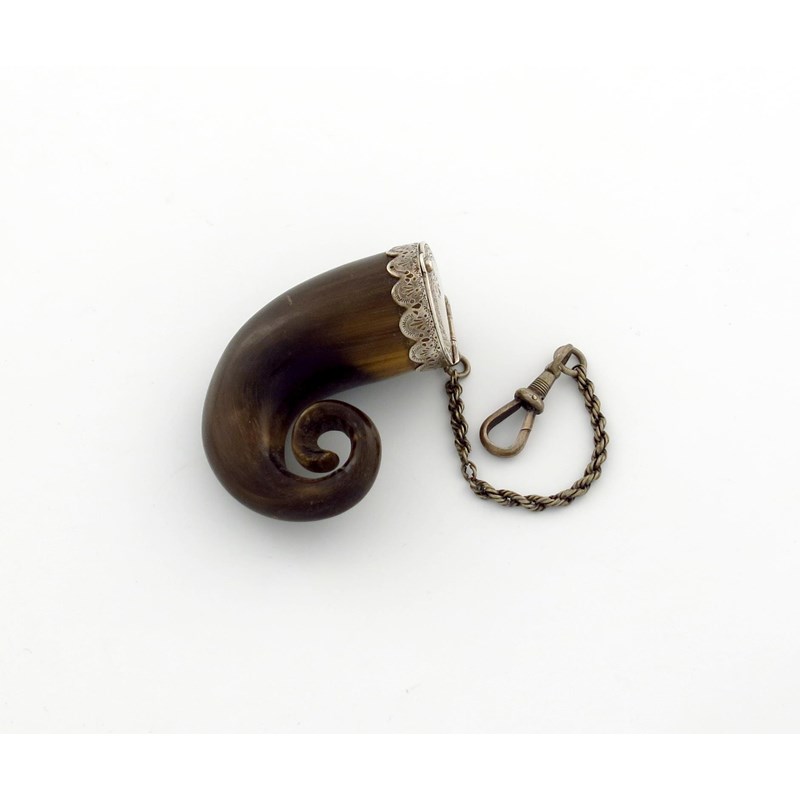 the mounts with engraved decoration, hinged cover, with a chain, length 5.5cm.
