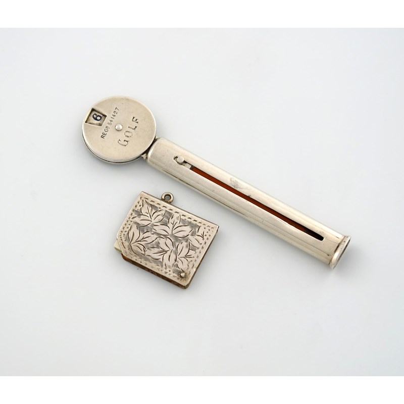 slide-action pencil, the circular terminal with the rotating card suits and inscribed 'Trumps', the reverse inscribed 'Golf', length 8.5cm, plus a silver trumps marker, Chester 1906, foliate decoration, with swing-out markers. (2)