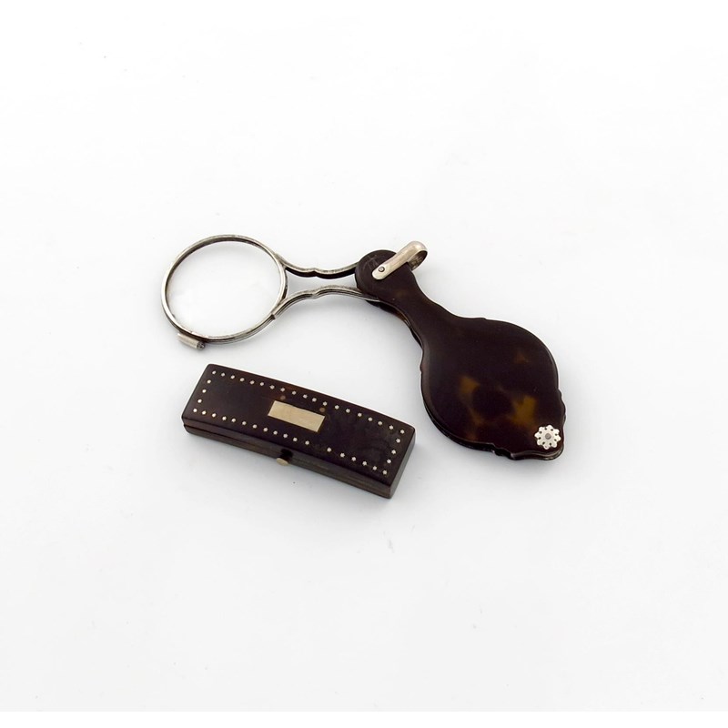 rectangular form, the cover with star decoration, plus a silver-mounted tortoiseshell eye glass, of shaped form, with a loop attachment, length open 14cm. (2)