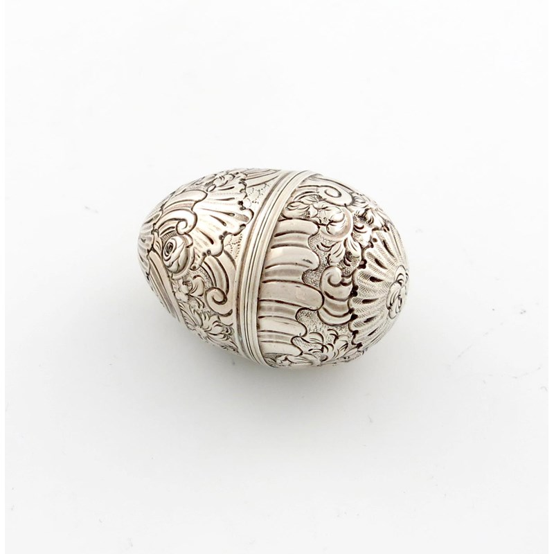 egg form, chased foliate scroll decoration, the interior with a pull-out pierced silver-gilt grille, length 0.4oz.