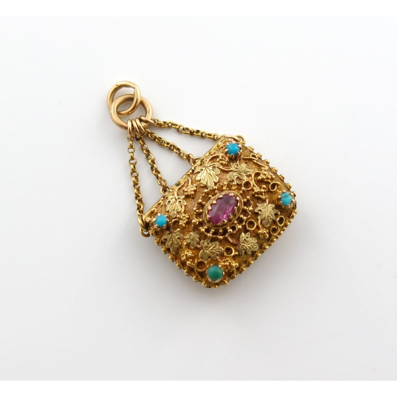 rectangular form, the front with two colour vine leaves and set with stones, with a ring attachment and four chains, plain pierced grille, length 2cm.