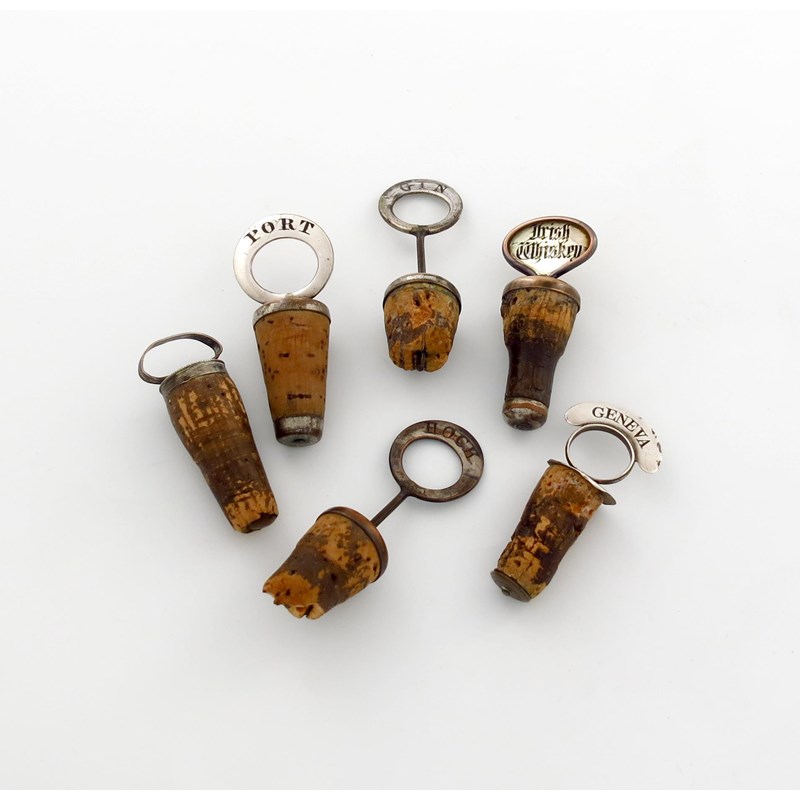 kidney form, incised 'GENEVA', plus a pair of old Sheffield plated bottle stoppers, 'HOCK' and 'GIN', and three other bottle stoppers. (6)