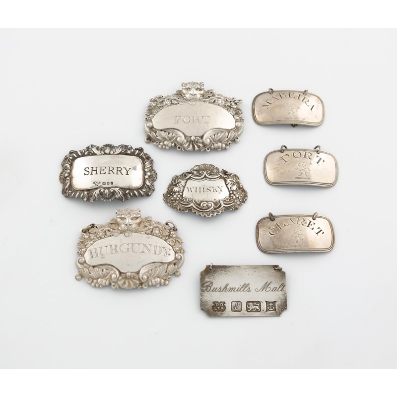 comprising: a set of three George III armorial wine labels, by Phipps and Robinson, London 1796, rounded rectangular form, incised 'PORT', 'CLARET' and 'MADEIRA', above a crest of a rampant lion, plus three modern wine labels and a pair of electroplated wine labels. (8)