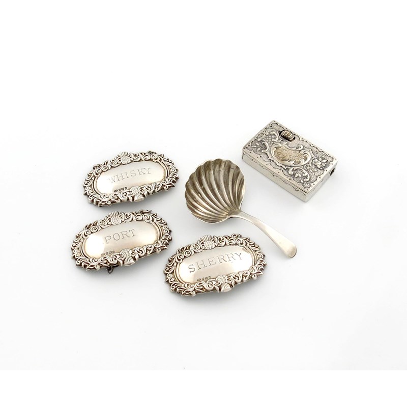 comprising silver items: a set of three modern wine labels, by W I Broadway & Co, Birmingham 1996, with foliate and thistle border, inscribed 'WHISKY', 'PORT' and 'SHERRY', a George III caddy spoon, by Urquhart & Hart, London 1811, with a shell shaped bowl, and an Austro-Hungarian matchbox with embossed cover, approx. weight 3.6oz. (5)