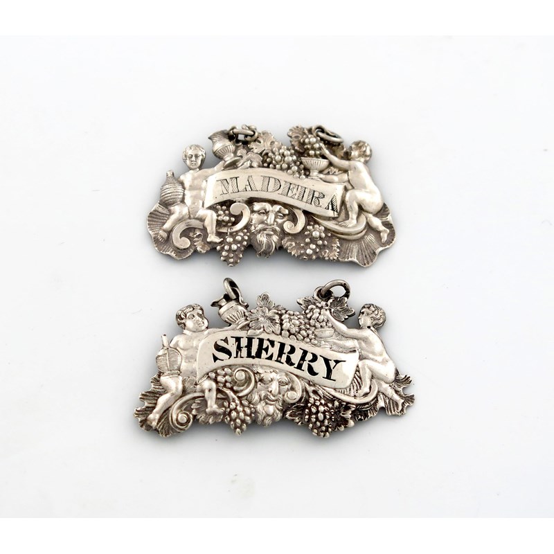 modelled as cupids holding jugs, an urn and with bunches of grapes, incised 'MADEIRA', plus a similar label, by Joseph Price, pierced 'SHERRY', approx. weight 0.9oz. (2)