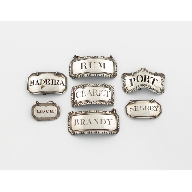comprising: a George III label, by Hester Bateman, London circa 1780, shaped rectangular form, feather-edge border, pierced 'PORT', length 4.8cm, a label by Richard Binley, incised 'CLARET', plus a pair of unmarked labels, 'RUM' and 'BRANDY', plus two further Georgian labels 'MADEIRA' and 'RUM' and an old Sheffield plated label 'HOCK'. (7)