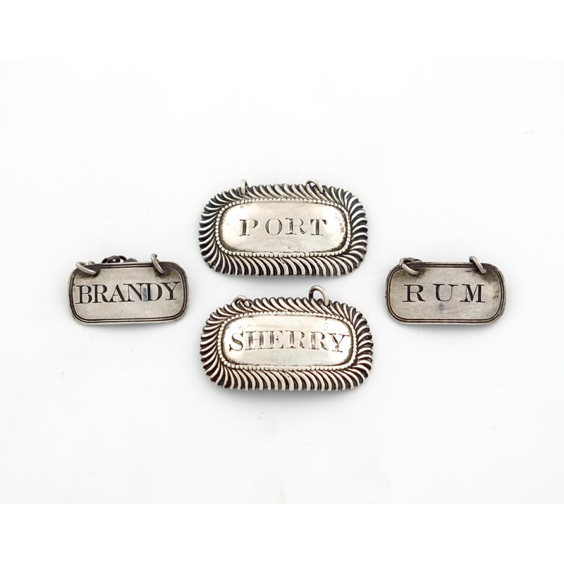 rounded rectangular form, rope-work borders, incised 'PORT' and 'SHERRY', length 4.5cm, plus a pair of small George III wine labels, London 1803, incised 'BRANDY' and 'RUM', approx. weight 1.4oz. (4)