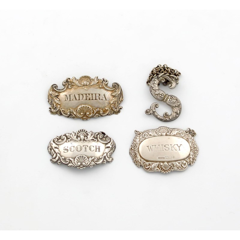 comprising: a George IV label, by William Hattersley, London 1828, shaped form, scroll and shell borders, incised 'MADEIRA', plus a Victorian cut-out letter label, 'S', by Rawlings and Summers, London 1847, foliate decoration, and two modern labels, approx. total weight 2oz. (4)