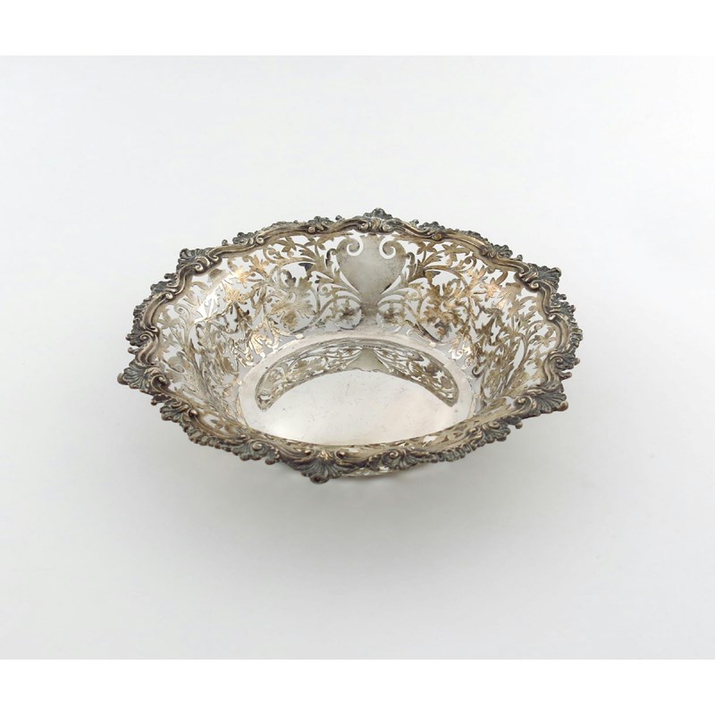 tapering circular form, pierced foliate scroll decoration, foliate and shell border, diameter 25.5cm, approx. weight 10.5oz.