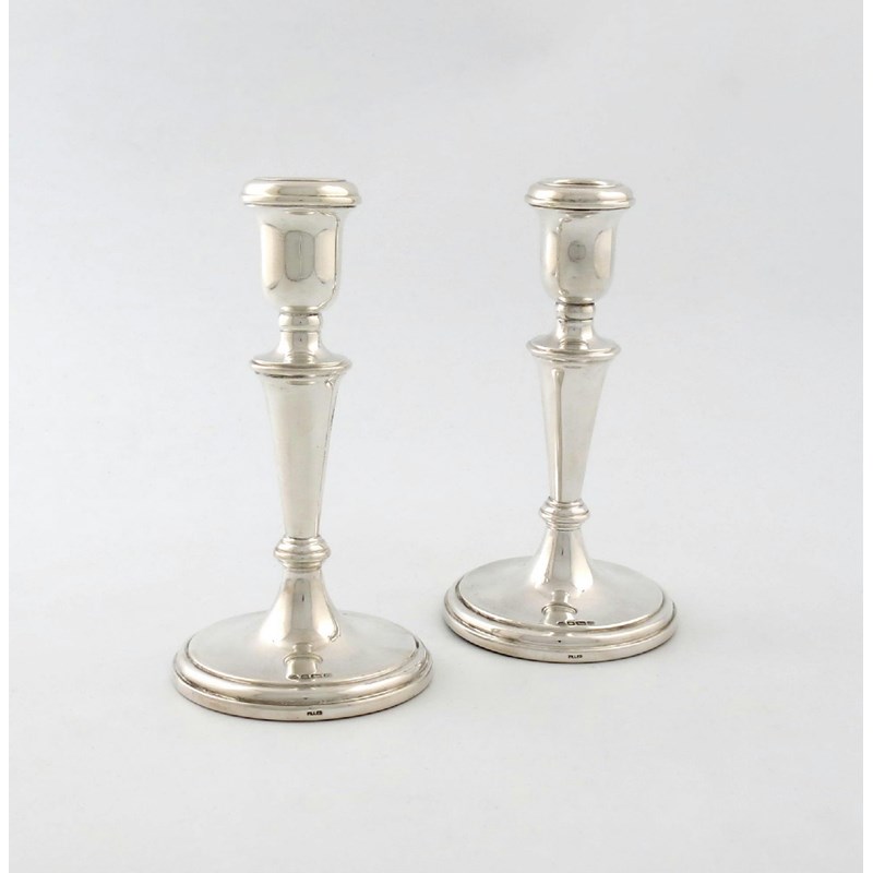 tapering circular form, plain urn capitals, on raised circular bases, height 17.5cm. (2)