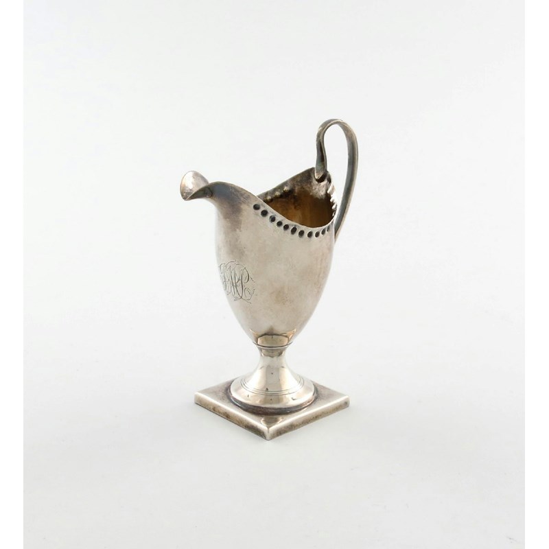 helmet form, punch bead border, scroll handle, engraved with a monogram, on a raised square foot, height 11.8cm, approx. weight 1.8oz.