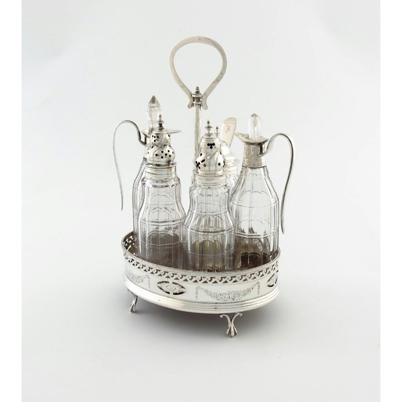 oval form, pierced and bright-cut decoration, central carrying handle, one foot later, with five George III and later silver-mounted condiment bottles and a spoon, height 26cm.
