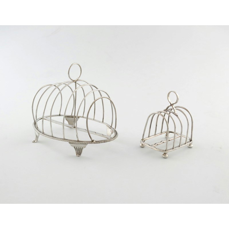 oval base, gadroon border, with seven wire-work bars and a central ring handle, on four fluted bracket feet, length 17cm, plus a silver five-bar toast rack, by Sebastian Garrard, London 1910, on a rounded rectangular base, approx. total weight 9oz. (2)