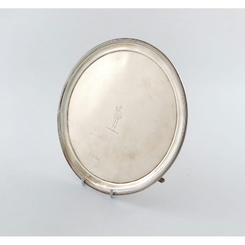circular form, reeded border, the centre with a crest, on three fluted bracket feet, diameter 22.8cm, approx. weight 12oz.