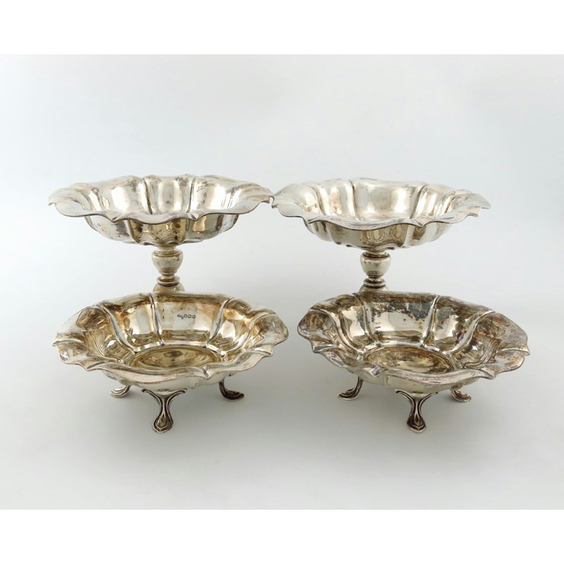 two sizes, lobed circular form, one on a raised pedestal base, the other of four scroll feet, height of larger 15.2cm, diameter of smaller 19.4cm, approx. weight 55oz. (4)