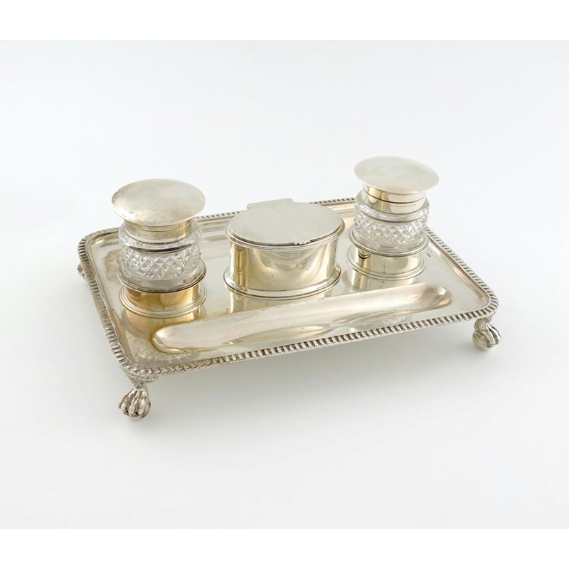 rectangular form, with a central box compartment, of oval form, and with two pen wells and two silver-mounted cut glass inkwells of cylindrical form, length 29cm, approx. weight 30oz.