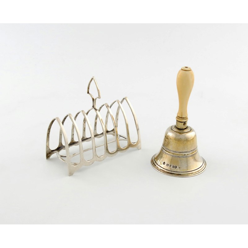 conventional form, with a turned ivory baluster handle, height 13cm, plus a seven bar toast rack, Sheffield 1907, approx. total weight 9.5oz. (2)