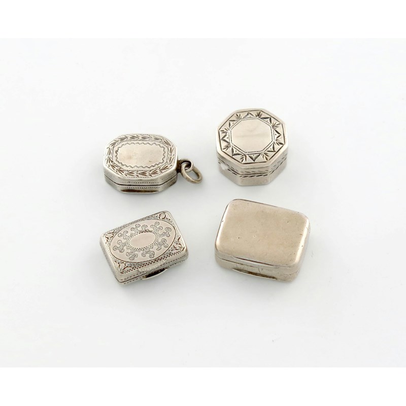 comprising: a George IV one, by Joseph Taylor, Birmingham 1822, rectangular form, engraved decoration, one of octagonal form, Birmingham 1799, plus one of rectangular form, and one other, approx. weight 1.1oz. (4)