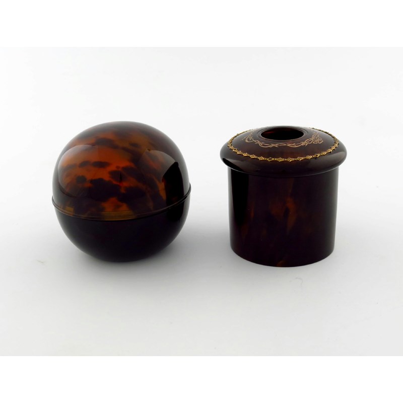 circular form, the pull-off cover applied with a gold swag border and inlaid with ribbon-tied decoration, plus a tortoiseshell powder pot of globular form, height 9.5cm. (2)